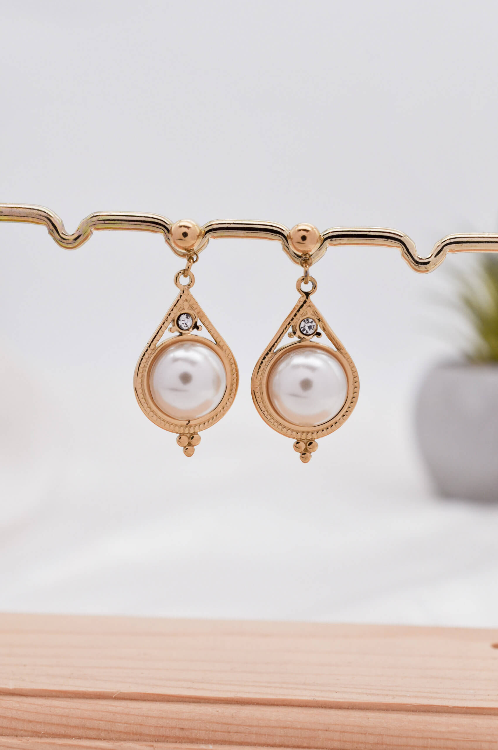 Σκουλαρίκια σε σχήμα δάκρυ με πολυτελή χρυσή ή ασημένια απόχρωση, διακοσμημένα με λαμπερές λευκές πέρλες και διακριτικά λευκά κρυστάλλινα στοιχεία. Ένα εκλεπτυσμένο κόσμημα που συνδυάζει ρομαντισμό και κλασική κομψότητα, ιδανικό για ιδιαίτερες περιστάσεις αλλά και για να αναβαθμίσει την καθημερινή σας εμφάνιση.