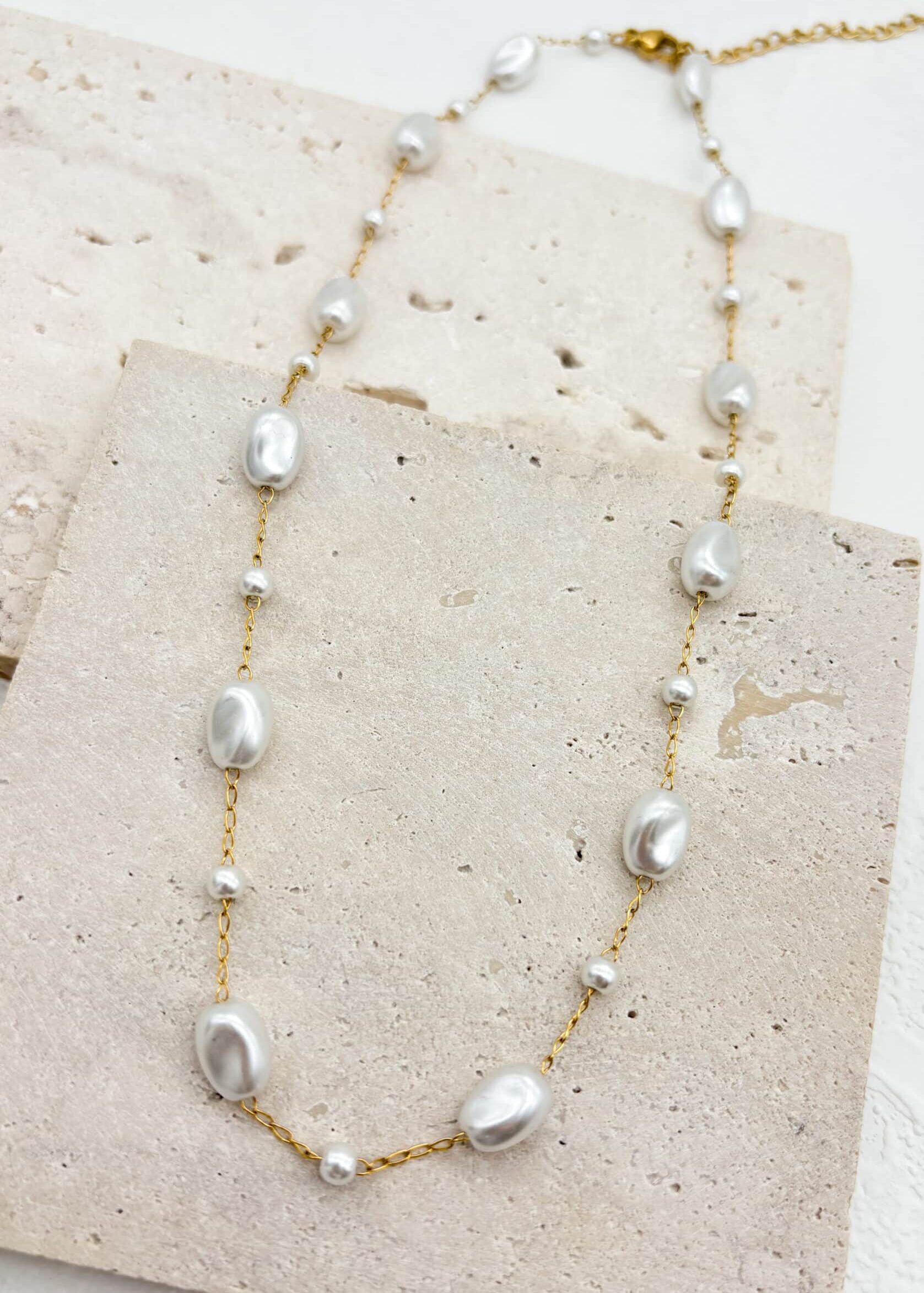 Κομψό κολιέ με χρυσή αλυσίδα και εναλλασσόμενες λευκές πέρλες σε οβάλ και στρογγυλό σχήμα. Ένα διαχρονικό κόσμημα που αποπνέει θηλυκότητα και φινέτσα, ιδανικό για να ολοκληρώσει κάθε σας εμφάνιση, από το πρωί μέχρι το βράδυ.